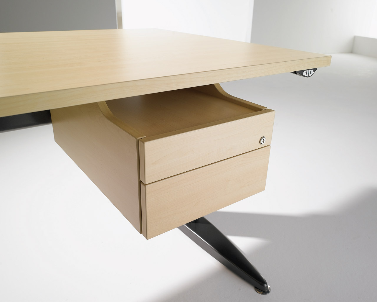 Der LIBERO Shuttle: Container mit Schubkasteneinteilung 1/2 HE und Zentralverschluss mit Sicherheitsschloss. Der Shuttle hebt und senkt sich mit der Tischplatte. Eine Ablage und Stauraum für Arbeitsutensilien ist immer in der Nähe.